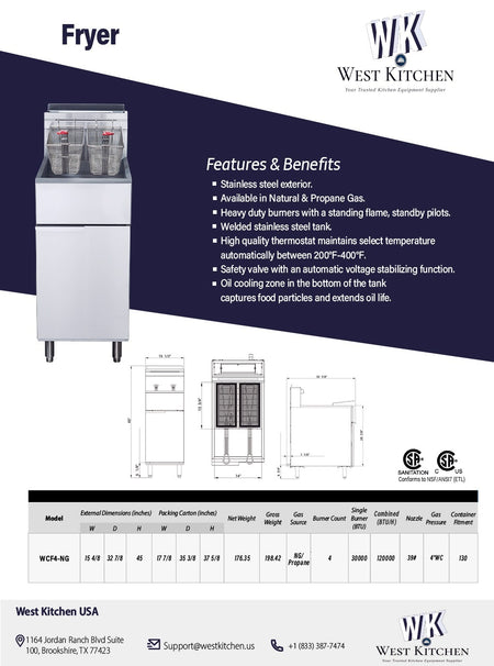 Unleash the power of precision frying with the West Kitchen WCF4-NG, a 50lb. Natural Gas Deep Fryer featuring four dynamic tube burners. Designed for culinary brilliance, this fryer is crafted to elevate your appetizers and entrees to perfection.