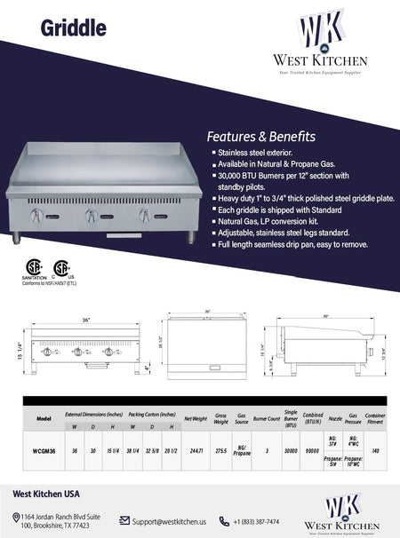 Unleash your culinary prowess with the West Kitchen WCGM36 36"W NG/LP Gas Manual Countertop Griddle, a powerhouse of precision and versatility. Crafted with the needs of professional chefs in mind, this countertop griddle combines the flexibility of natural gas (NG) or propane (LP) with robust features to redefine your cooking experience.