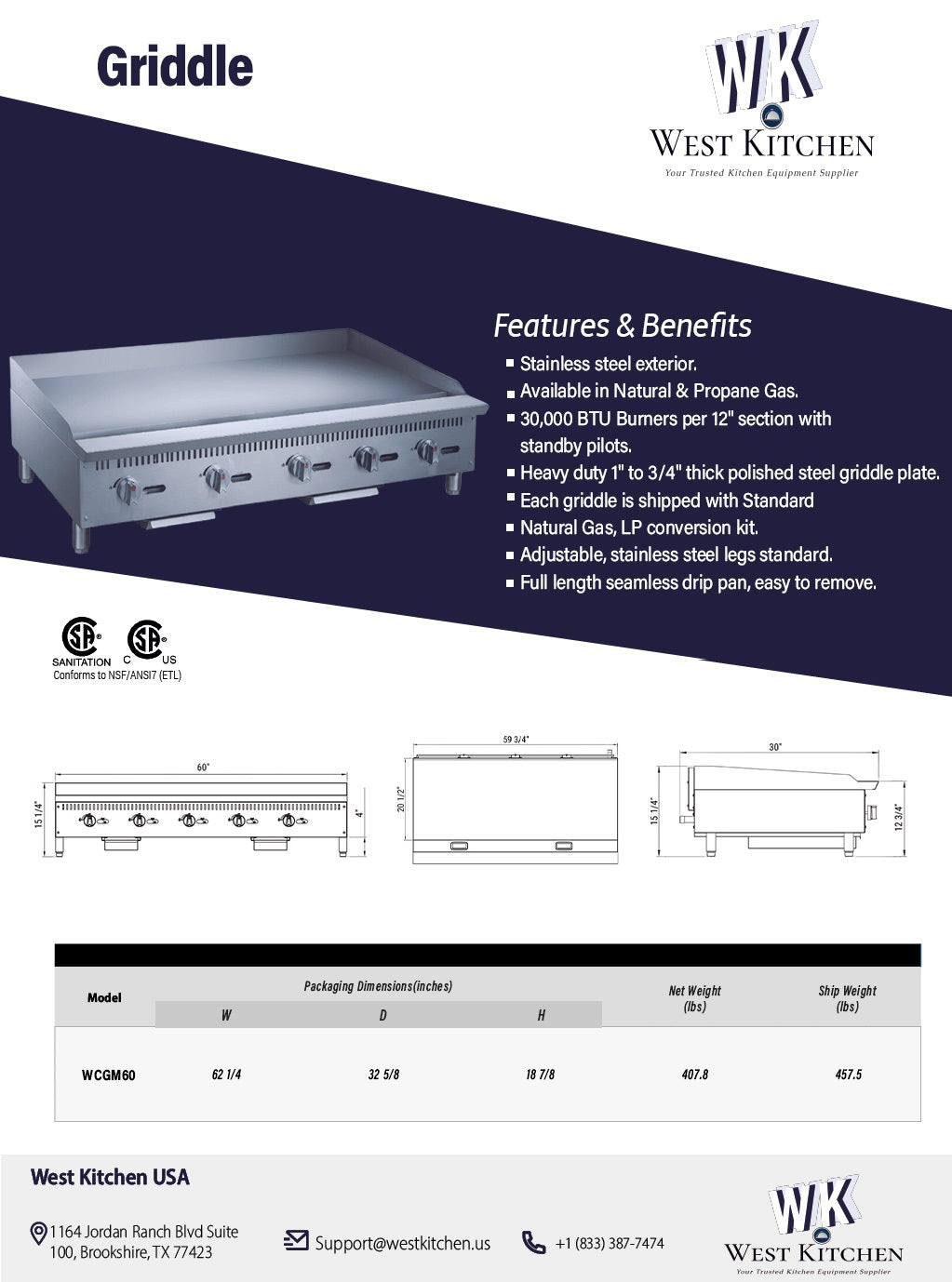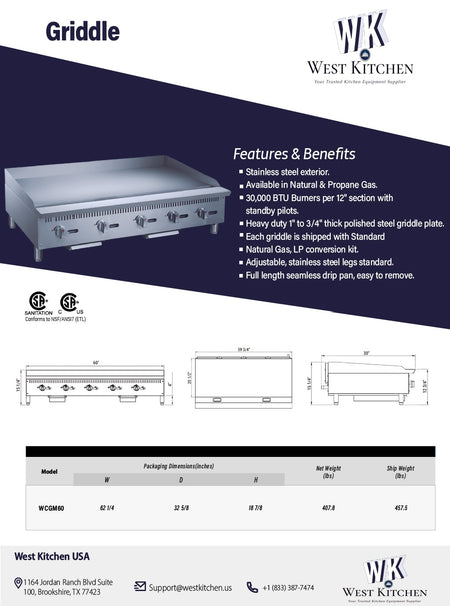 Elevate your kitchen capabilities with the West Kitchen WCGM60 60" NG/LP Gas Manual Countertop Griddle, a culinary powerhouse designed for precision and efficiency. This griddle offers the flexibility of natural gas (NG) or propane (LP) and is equipped with features that make it a must-have for professional chefs.