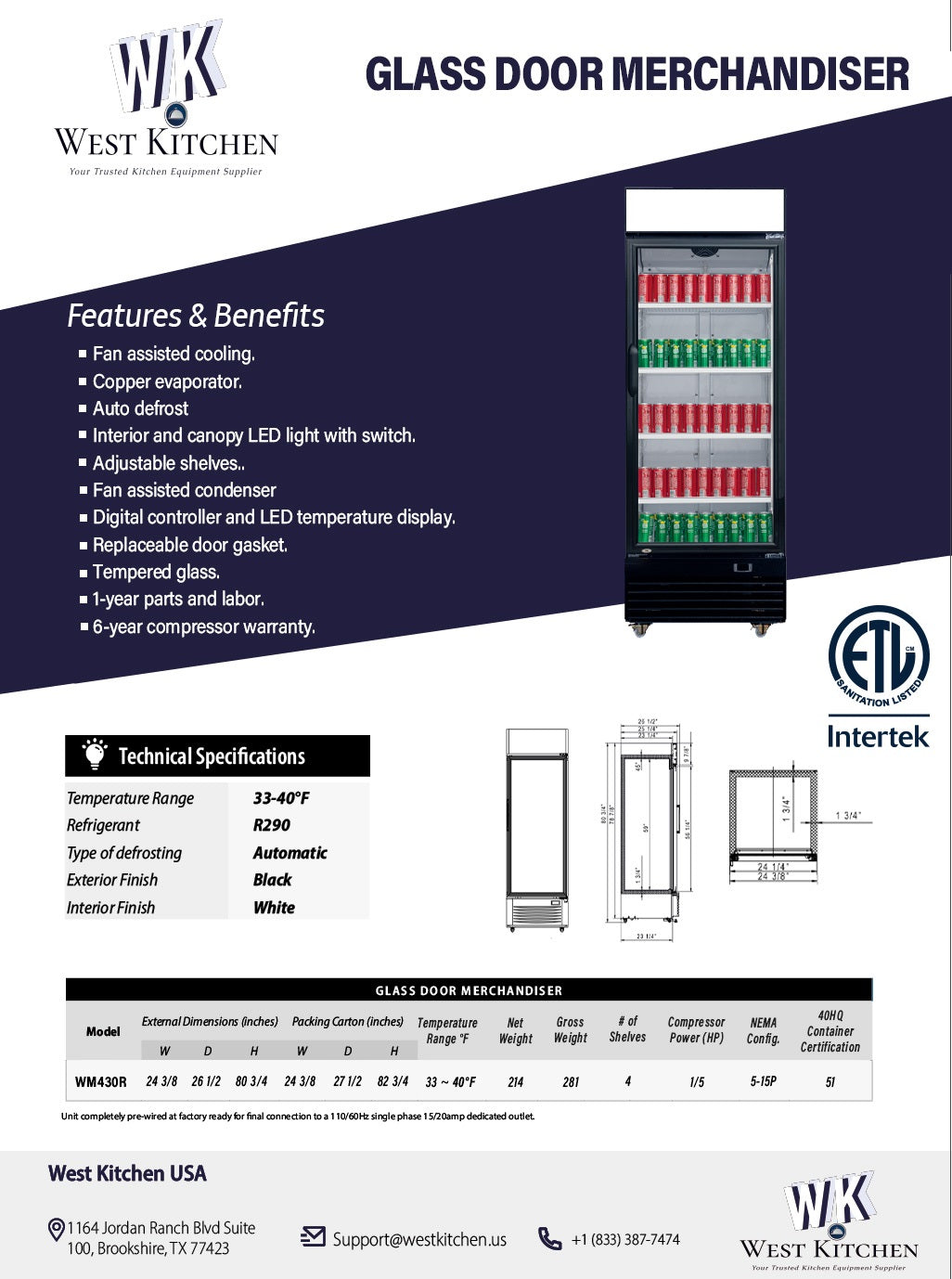 Enhance the visibility and accessibility of your merchandise with the West Kitchen WTG-430 Glass Merchandiser Refrigerator—a perfect blend of style, efficiency, and reliability for your business refrigeration needs.